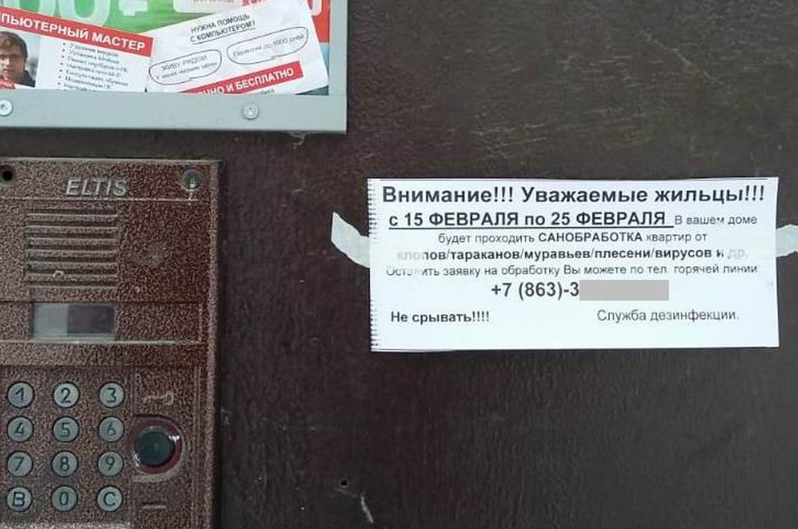 Попробовали мы поискать в Ростове такую фирму - не нашли. Указанный телефон тоже ни за какой фирмой не закреплён. Решили позвонить. Как оказалось - некий колл-центр, где сотрудница ответила, что это частная фирма, но где находится офис, отвечать отказалась. Сообщила, что, раз есть объявление на дверях, значит в доме проводятся работы в каких-то квартирах. И пока такое объявление присутствует, можно заказать обследование квартиры на предмет необходимости дезинсекционных мероприятий. Правда, девушка говорила почему-то о дезинфекции, но тут уж не станем судить строго за неразборчивость в смысловых тонкостях русского языка. Девушка несколько раз подчеркнула, что, пока в доме работают специалисты службы, обследование квартиры на предмет наличия в ней насекомых совершенно бесплатно, в другое время этот процесс платный. Больше сказать ничего не могла, а потому мы разговор и закончили.
