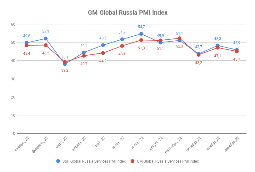 Декабрьское значение индекса деловой активности ГлобалМедиа PMI (GM Global Services Russia PMI Index) составило 45,1 п.п. против 47,1 п.п . в ноябре. Значение индекса деловой активности в сфере услуг от S&P Global (Global Russia Services PMI by the S&P Global) за аналогичный период уменьшилось с 48,3 п.п. до 45,9 п.п.