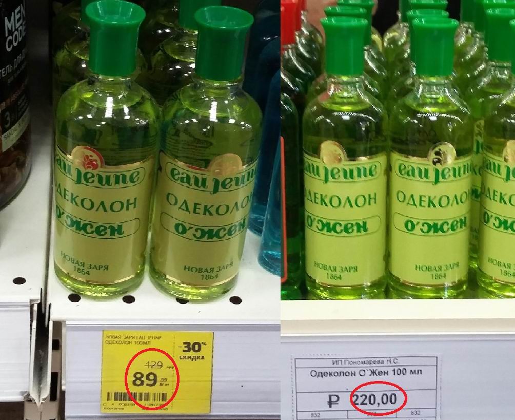 Мы объяснить не можем. Читательница прислала фото цен одеколона, сделанные в двух разных магазинах в один день. Может, кто-то из читателей сможет объяснить эту ценовую политику?
