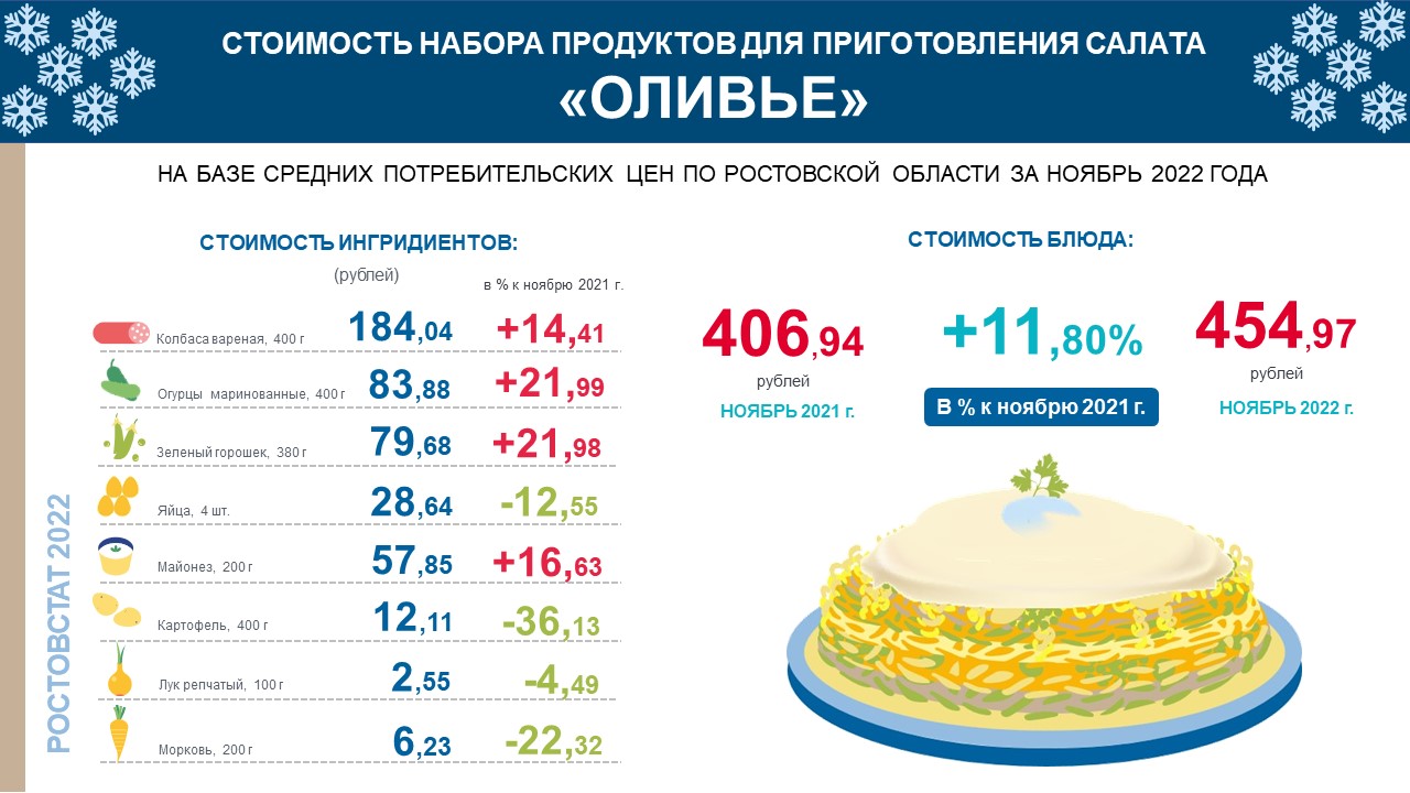 За год – с ноября 2021 по ноябрь 2022 – стоимость ингредиентов, необходимых для приготовления этих салатов, в Ростовской области выросла на 11,80% для «Оливье» и на 6,78% для «Сельди под шубой».