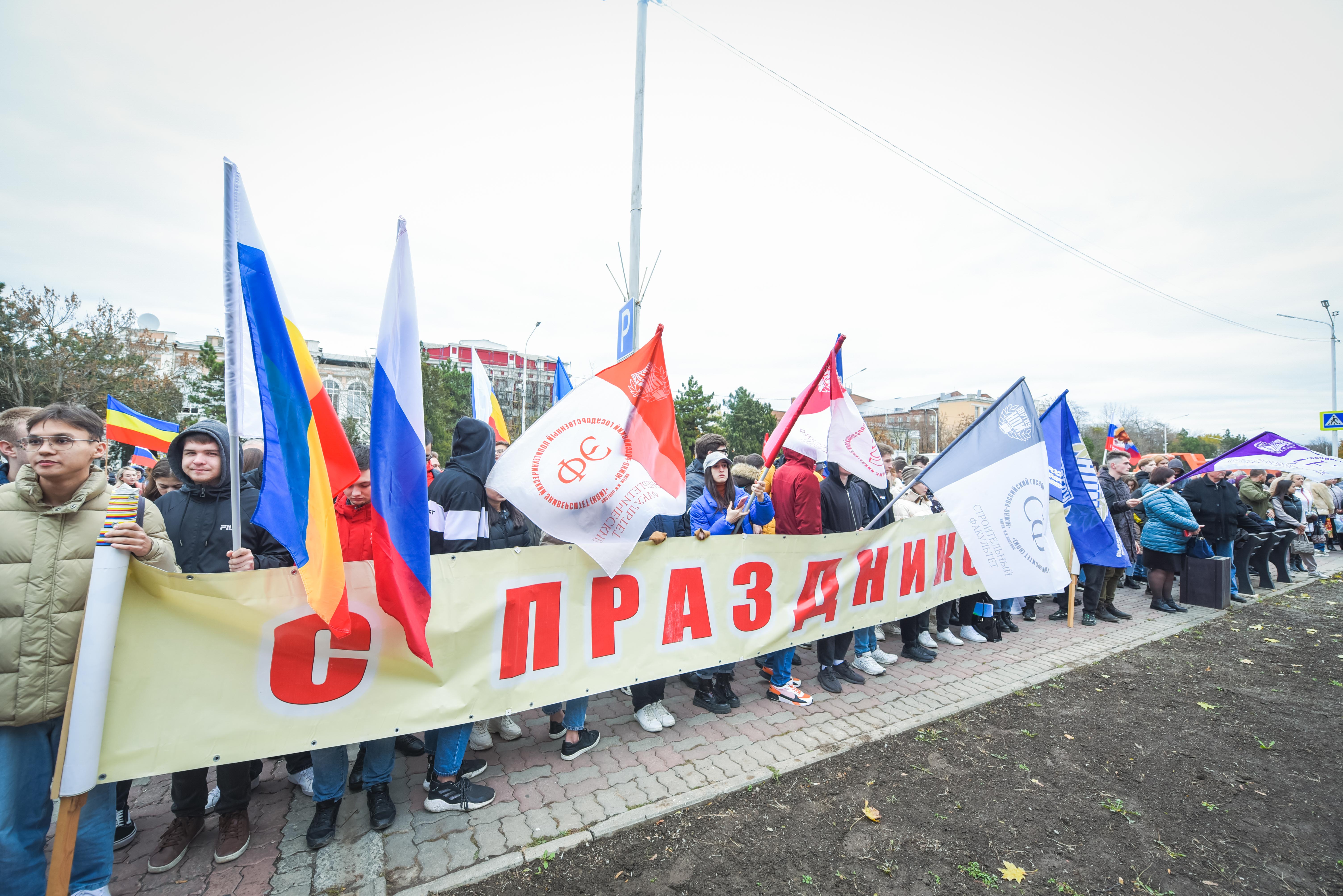 Новочеркасские политехники - проректор ЮРГПУ (НПИ) Е.Б. Журченко, председатель первичной профсоюзной организации обучающихся Ю.С. Тышлангян и студенческий актив университета - приняли участие в торжественном митинге, который прошёл в канун Дня народного единства на площади у здания Администрации города.