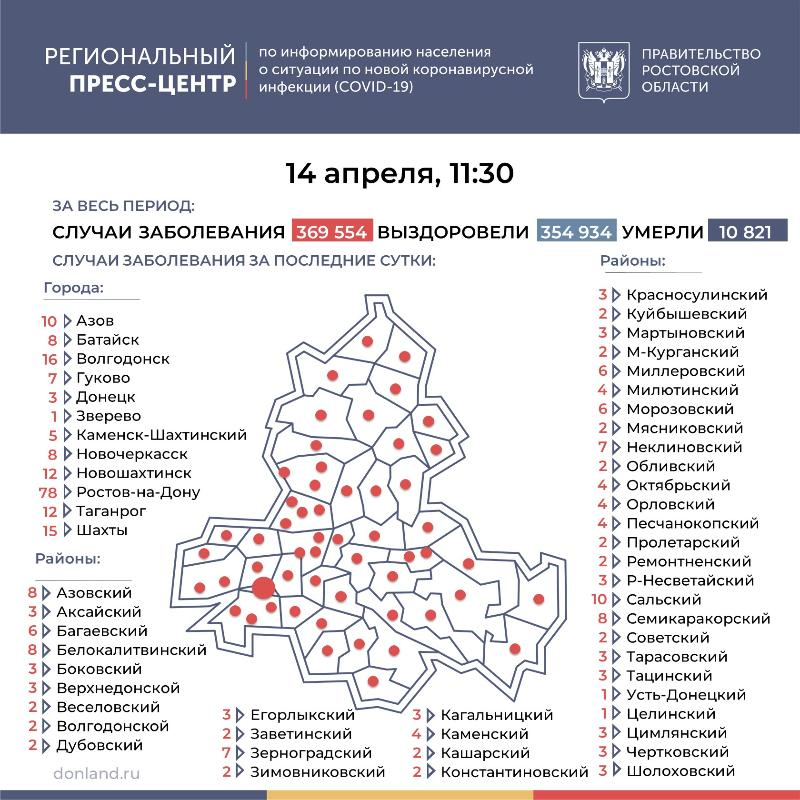 Общее число заболевших в регионе на 14 апреля составляет 369554. Показатель заболеваемости коронавирусом 8794 на 100 тысяч населения. Коэффициент распространения инфекции - 0,67.