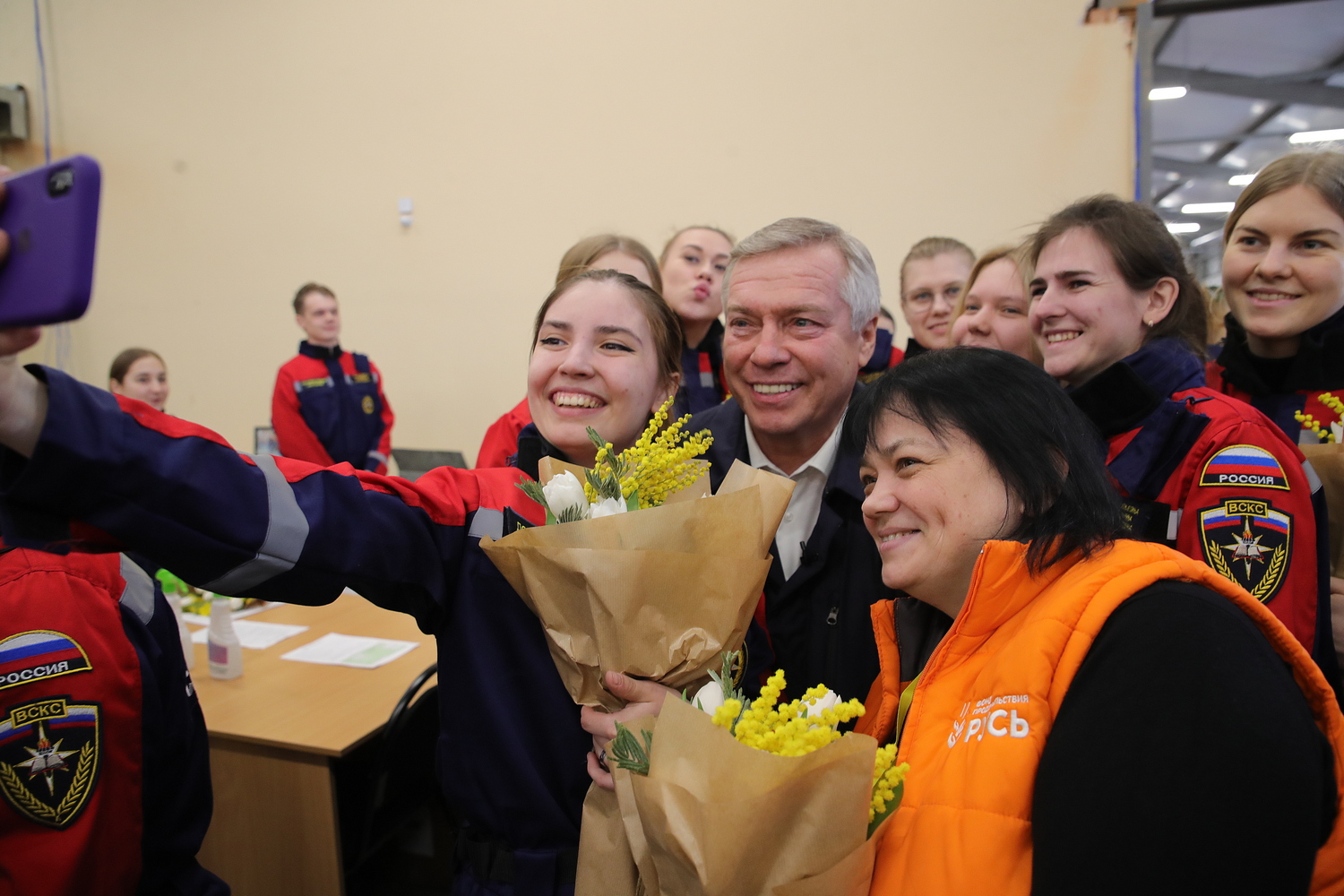 Накануне Международного женского дня донской губернатор Василий Голубев побывал в ресурсном центре подготовки добровольцев в сфере ЧС, навестив волонтёров, которые трудятся на едином складе гуманитарной помощи на базе ДГТУ.