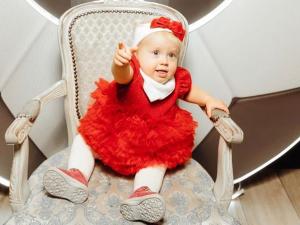 На кадре маленькая Мила позирует, сидя на стуле. Для образа малышке выбрали пышное красное платье и бант того же цвета. Вместе с семьей они отметили 11 месяцев дочери.