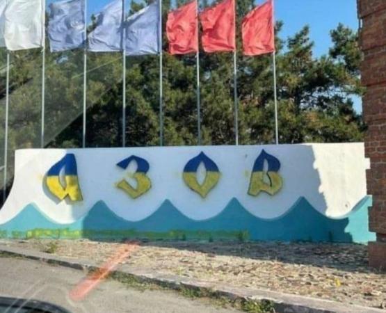 Азовская полиция разыскивает хулиганов, окрасивших постамент на въезде в город в желто-синие, украинские цвета.