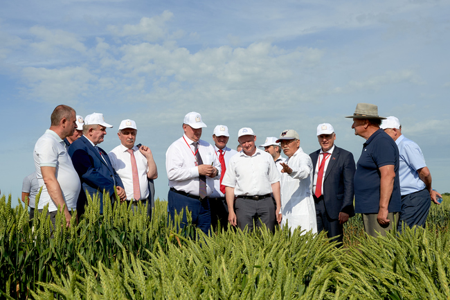 Владимир Иванович Кашин и с сопровождавшие его депутаты Государственной Думы Коломейцев Н.В., Бессонов Е.И., Арефьев Н.В., Осадчий Н.И. и руководитель фракции КПРФ в Законодательном Собрании Ростовской области Мисан А.В. ознакомились с новыми сортами пшеницы и гороха.