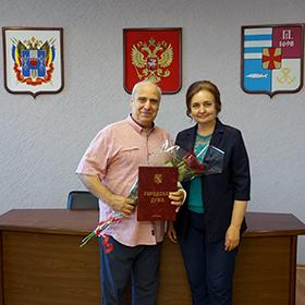 Председатель Городской Думы – глава города Таганрога Инна Титаренко тепло поздравила Евгения Токарьяна с юбилеем, вручив ему Почётную грамоту Городской Думы. Глава города отметила профессионализм и неизменный позитивный настрой юбиляра, пожелав ему здоровья, благополучия и новых творческих успехов.