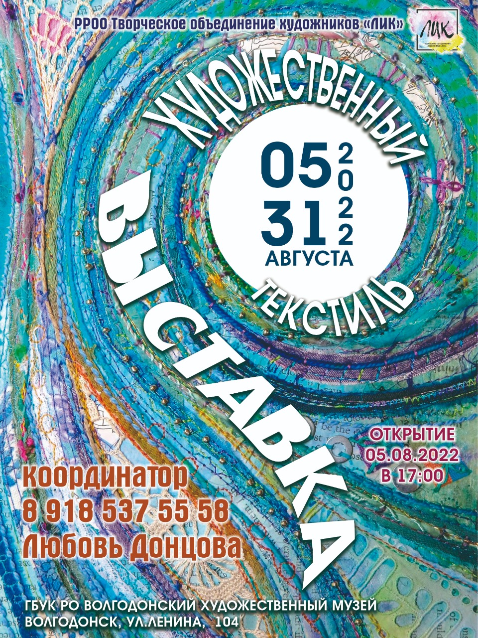 5 августа, в городском художественном музее (ул. Ленина,104) открывается выставка РРОО Творческое объединение художников «ЛИК» — «Художественный текстиль».