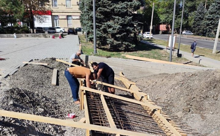 Кроме этого сейчас рабочие занимаются установкой системы автополива. Параллельно специалисты подрядной организации укладывают пешеходные дорожки. К настоящему моменту подготовлено основание площадки для асфальтирования, ведётся подготовка основания для посадки газона.