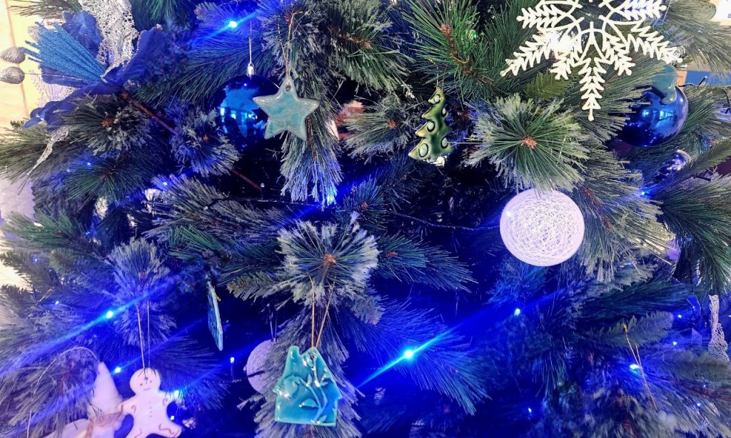Елку в администрации Таганрога украсили керамические игрушки, созданные руками людей с ментальными особенностями.