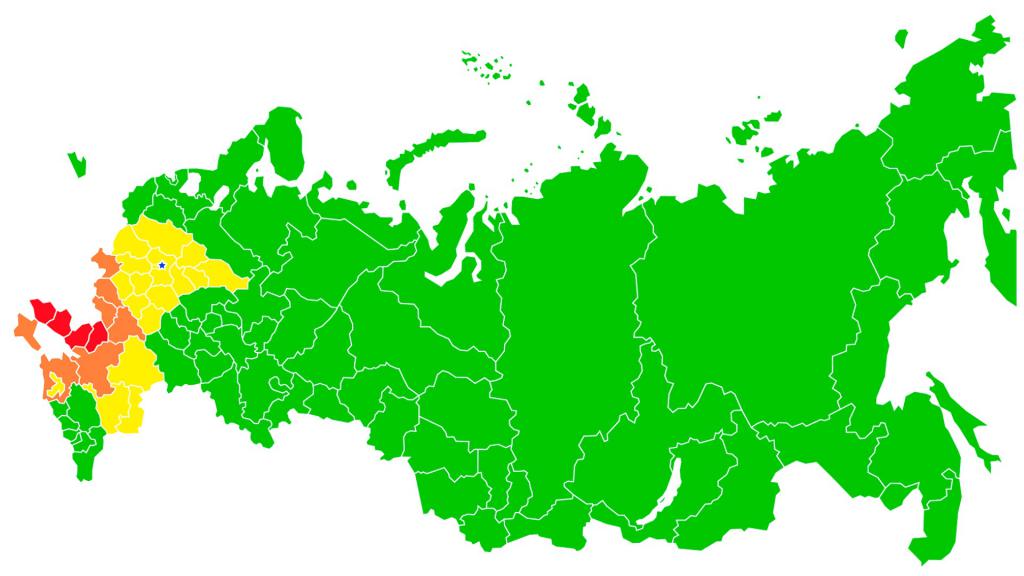 В Республике Крым, Краснодарском крае, Белгородской, Брянской, Воронежской, Курской, Ростовской областях, в Севастополе вводится средний уровень реагирования. Там, в дополнение к этим мерам могут временно отселять жителей в безопасные районы с обязательным предоставлением таким жителям стационарных или временных жилых помещений, будет введен особый режим въезда на территорию и выезда с нее, не исключено и ограничение свободы передвижения по региону.