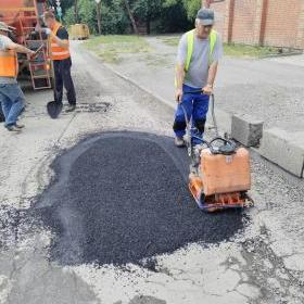 Выполняется продувка ям от пыли и грязи, обработка битумом, устройство асфальтобетонного покрытия, его уплотнение при помощи виброплиты.