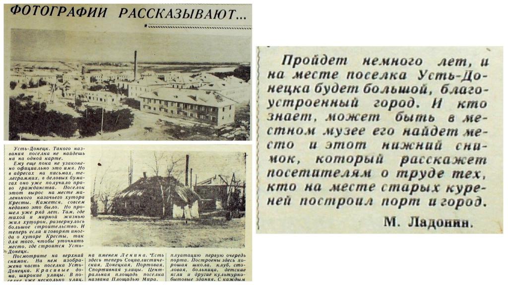 Знакомство с историей района начнется с заметки «Фотографии рассказывают...», опубликованной 12 октября 1960 года в выпуске № 121 газеты «Советский Дон» Раздорского района. Эта статья касается строительства поселка Усть-Донецкого порта, которое началось в марте 1956 года. На фотографиях изображены улицы молодого поселка. Предлагаем вам посмотреть на фото и вспомнить какие улицы поселка изображены на фото.