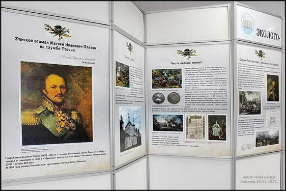 В основе выставки – информация о важных вехах жизненного пути М.И. Платова, размещённая на 15 красочных баннерах. Посетители узнают много интересного о детстве и юности Матвея Платова; об административных и военных преобразованиях на Дону во время деятельности в качестве атамана Войска Донского. Иллюстрации картин известных художников, фотокопии документов, карт сражений помогут ярче представить героические подвиги при штурмах Очакова и Измаила; о мужестве в сражении при Прейсиш-Эйлау и Бородино.