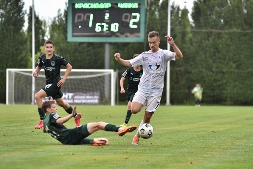 Начать матч наша команда попыталась с позиции силы, организовала несколько атак на старте и за три минуты заработала три угловых. Затем инициатива постепенно перешла к черно-зеленым. Игровым преимуществом «быки» владели до середины первого тайма, пока хозяевам не пришлось доставать мяч из сетки. Даниил Левко заработал штрафной на правом фланге. Матвей Тороп закрутил левой в створ. Вратарь «Краснодара» зафиксировать мяч не сумел. А Ратмир Боташев оказался первым на отскоке — 1:0. Этот гол стал для нашего нападающего 11-м в ЮФЛ Юг.