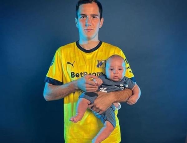 В кадре спортсмен появился с малышом на руках. Кроху Савелия одели в серый костюмчик. Его знаменитый папа появился в форме «желто-синих».