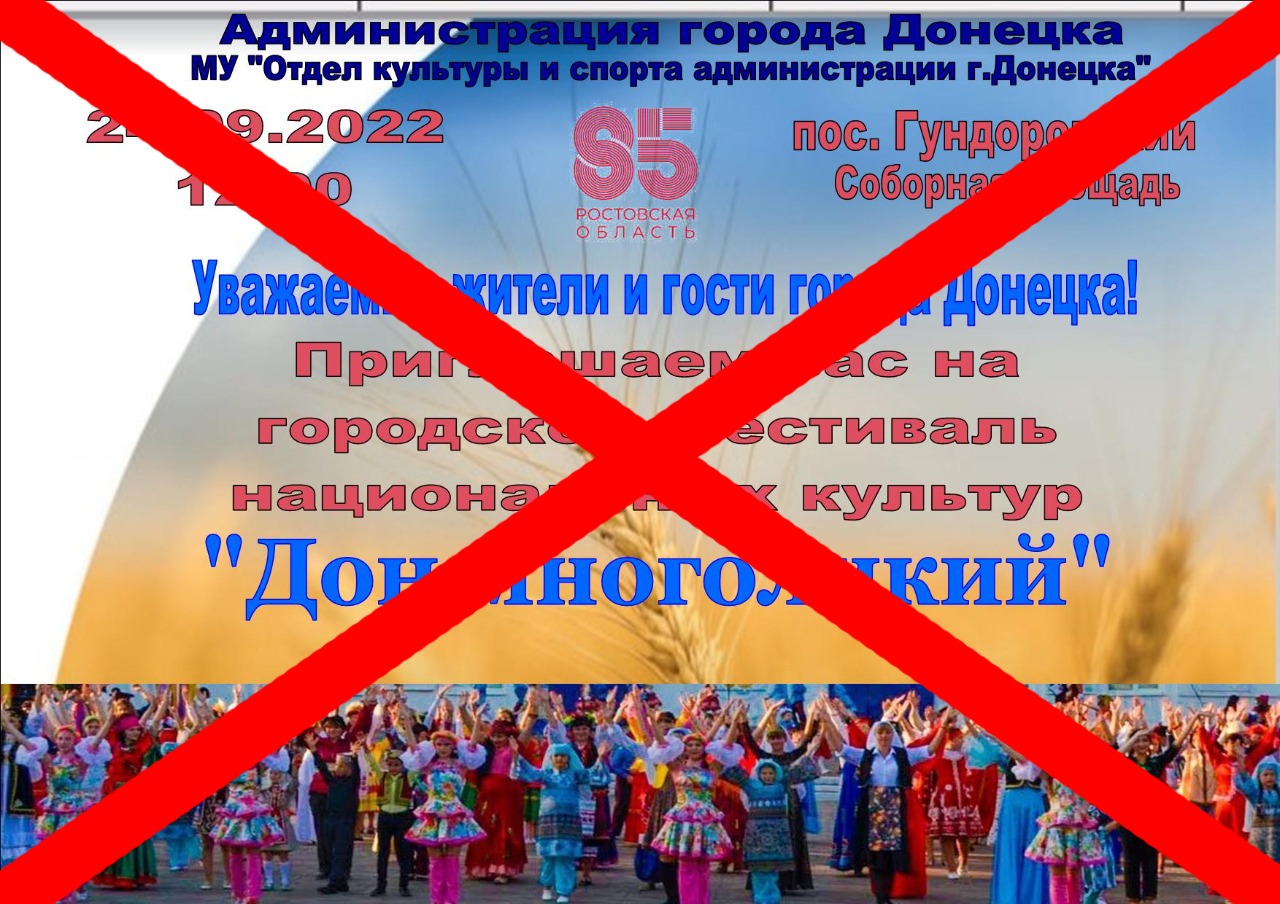 В соответствии с рекомендациями Управления Федеральной службы по надзору в сфере защиты прав потребителей и благополучия человека по Ростовской области, связанными с недопущением распространения новой коронавирусной инфекции (COVID-19), проведение городского фестиваля национальных культур «Дон многоликий», запланированного на 24.09.2022 в 12.00, отменено.
