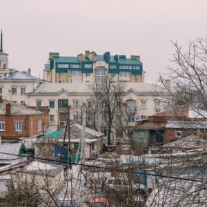 Вид с балкона на центральную улицу- Московскую и на зелёный двор. В общем дворе дома есть место для парковки автомобиля.