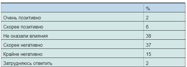 Таблица 1. «Как повлияли на работу Вашей компании зарубежные санкции, введённые против России и отдельных российских корпораций?» , в % от всех опрошенных женщин-предпринимателей