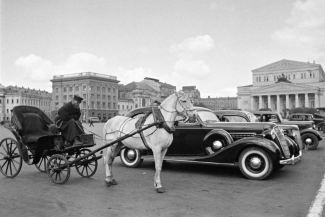Аркадий Шайхет. «Извозчик и автомобиль. Стоянка такси у Большого театра», Москва, 1935 год. / mkram.ru