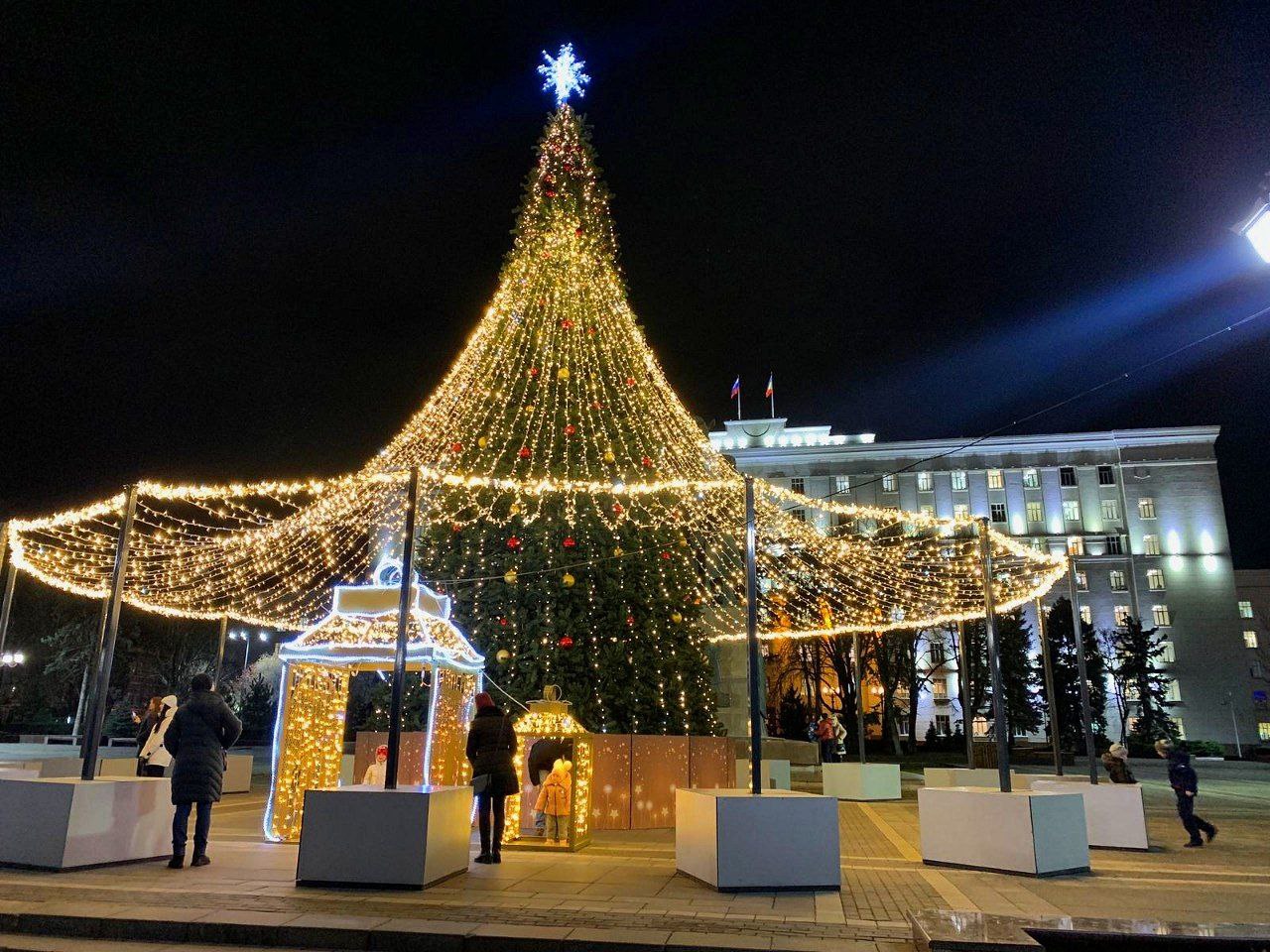 На площади Советов установлены новогодняя елка с шатром, светящаяся арка «2023», световые деревья, ажурный и рождественский фонари. На Соборной площади и на пересечении Пушкинской с Ворошиловским - «Новогодние часы».