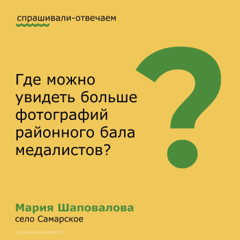 Фотографии районного «Бала медалистов» можно посмотреть по ссылке: https://clck.ru/3BiDpc , а также на страницах образовательных учреждений Азовского района в социальной сети «ВКонтакте».