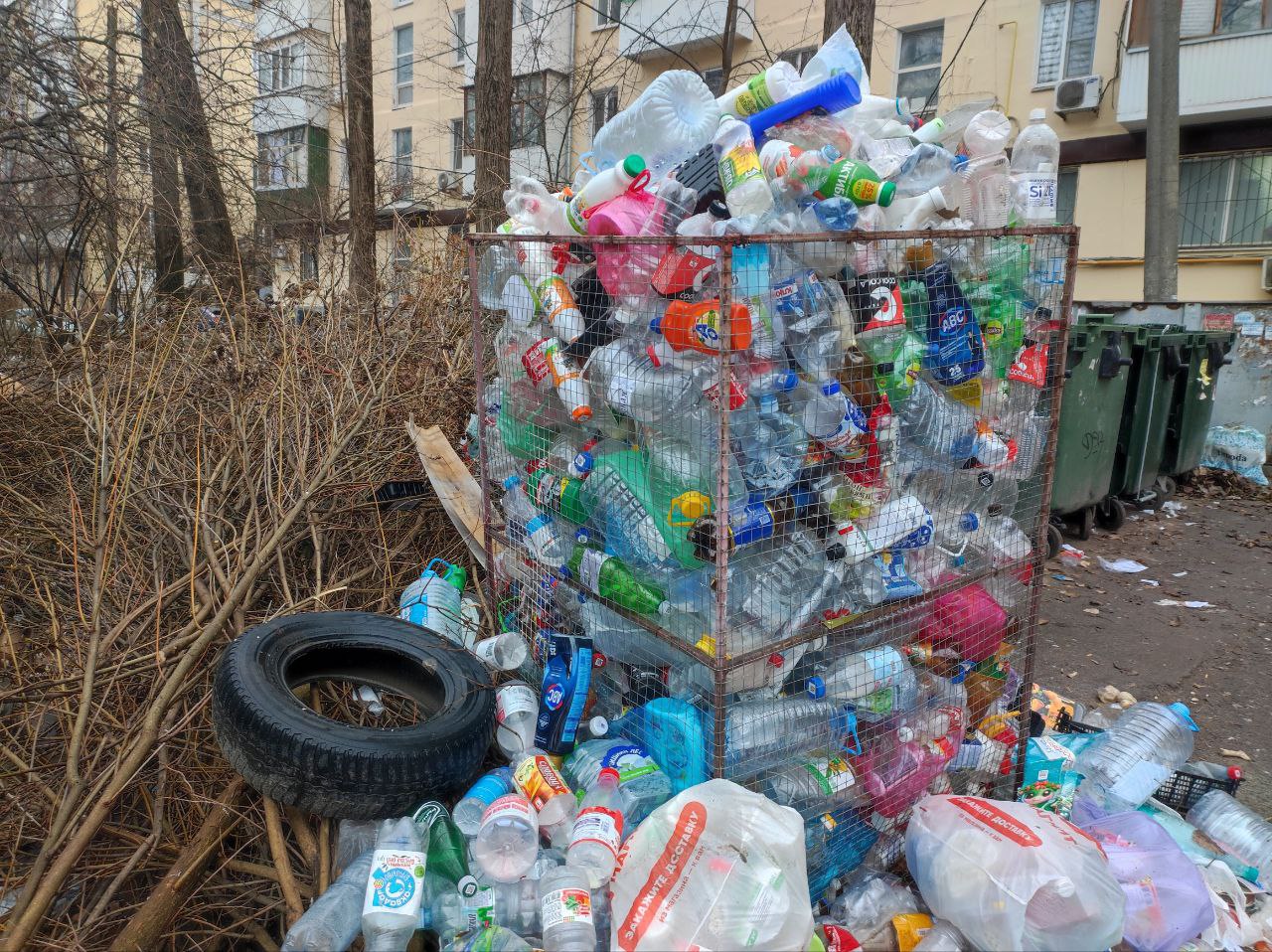 Пластик не вывозят несколько недель. Люди выбрасывают - а куда его складировать? Всё развозится машинами, разносится ветром по двору.