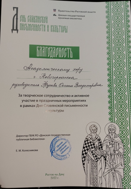 20 мая в Донской публичной библиотке г. Ростова прошел концерт, посвященный Дню славянской письменности и культуры. Свои лучшие песни о Родине и любви исполнил Академический хор г. Новочеркасска. Коллектив получил благодарность от организаторов мероприятия и предлжение о дальнейшем сотрудничестве.