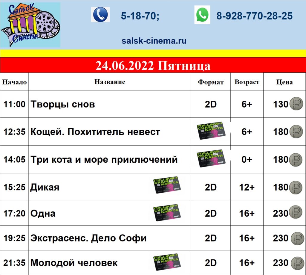 Подробнее — на salsk-cinema.ru и на страницах в социальных сетях.Билеты в «Сальск-синема» можно приобрести на сайте кинозала http://salsk-cinema.ru. Также доступна оплата банковской картой в кассе. Обратите внимание на сеансы, билеты на которые можно оплатить «Пушкинской картой» (эти сеансы отмечены в расписании). Отличный повод сходить в кино, при этом ещё и сэкономив, для молодых людей в возрасте от 14 до 22 лет.