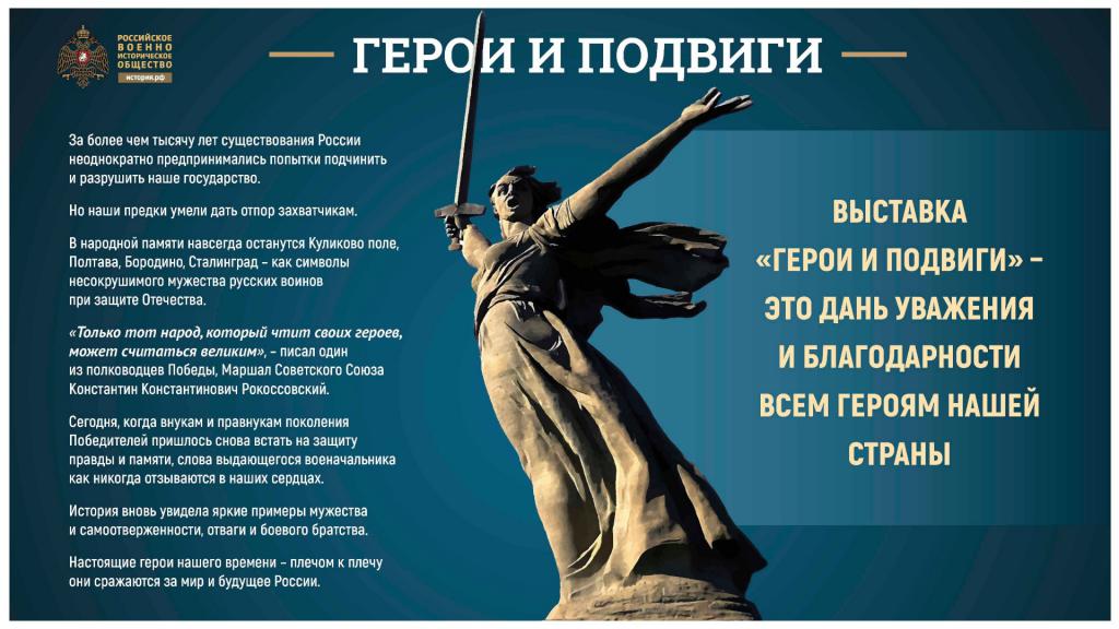 Российское военно-историческое общество совместно с рядом заинтересованных ведомств подготовило фотовыставку «Герои и подвиги», посвященную героям – участникам специальной военной операции.