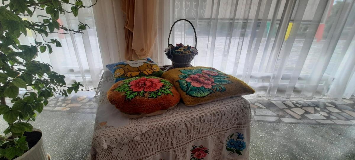 На выставке были представлены красочные картины, вышитые крестом, шелковыми лентами, бисером. Здесь же уютно размещались ажурные, вязанные крючком скатерти и мягкие подушечки, выполненные в стиле ковроткачество. Более крупный экспонат, выполненный в этой же технике- огромный ковер , поражал четкостью рисунков и яркостью красок. Неизменным интересом зрителей пользовались милые детские одеяла, выполненные в технике пэчвок . А сколько оригинальных поделок, сделанных из простых бумажных трубочек: шкатулки, корзиночки, конфетницы. Любители прекрасного любовались виртуозными завитками и причудливыми формами изделий из джута.