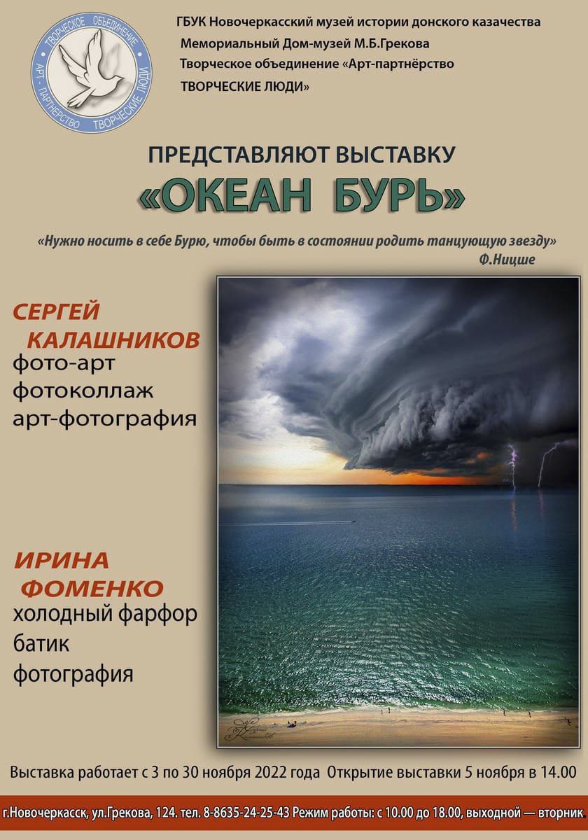 Оно объединяет и вдохновляет множество художников, за 6 лет объединение подготовило и провело 24 проекта. Данная выставка "Океан бурь" представляет творчество лидера объединения Сергея Калашникова и его старейшего члена Ирины Фоменко. Авторы работают в очень разных форматах и техниках, но их объединяет горячая любовь к искусству. Приглашаем жителей и гостей города посетить выставку по адресу: г Новочеркасск, ул Грекова, 124, тел для справок 24-25-43. Выставка работает до конца ноября.