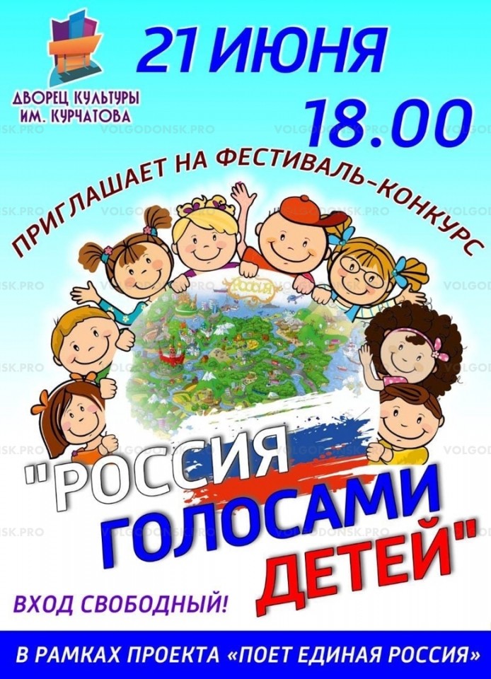 Волгодонцев приглашают на фестиваль «Россия глазами детей» в ДК им. Курчатова. Большая концертная программа пройдет 21 июня в 18.00 в большом зале дворца культуры. Перед зрителями выступят юные волгодонцы, которые в своих песнях расскажут о любви к своей родной стране. Вход свободный.