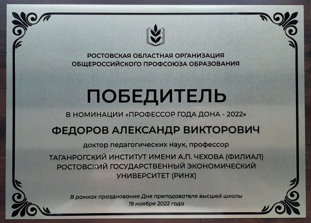 В номинации «Профессор года Дона – 2022» общественное признание получил Федоров Александр Викторович, доктор педагогических наук, член Союза кинематографистов России, академик Национальной Академии кинематографических искусств и наук России, президент Ассоциации кинообразования и медиапедагогики России, эксперт Аналитического центра при Правительстве РФ по проектам Комиссии при Президенте Российской Федерации по модернизации и технологическому развитию экономики России, профессор кафедры психолого-педагогического образования и медиакоммуникации факультета психологии и социальной педагогики Таганрогского института имени А.П. Чехова (филиала) Ростовского государственного экономического университета (РИНХ).