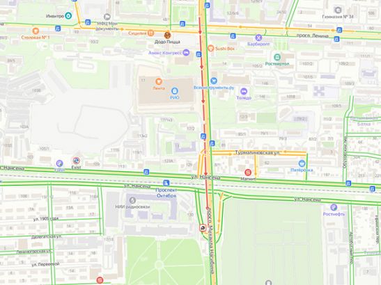 Из-за аварии на Нагибина образовалась серьезная пробка. Затор протянулся от улицы Нансена до проспекта Ленина. Скорость автомобилей на участке – не более семи километров в час.