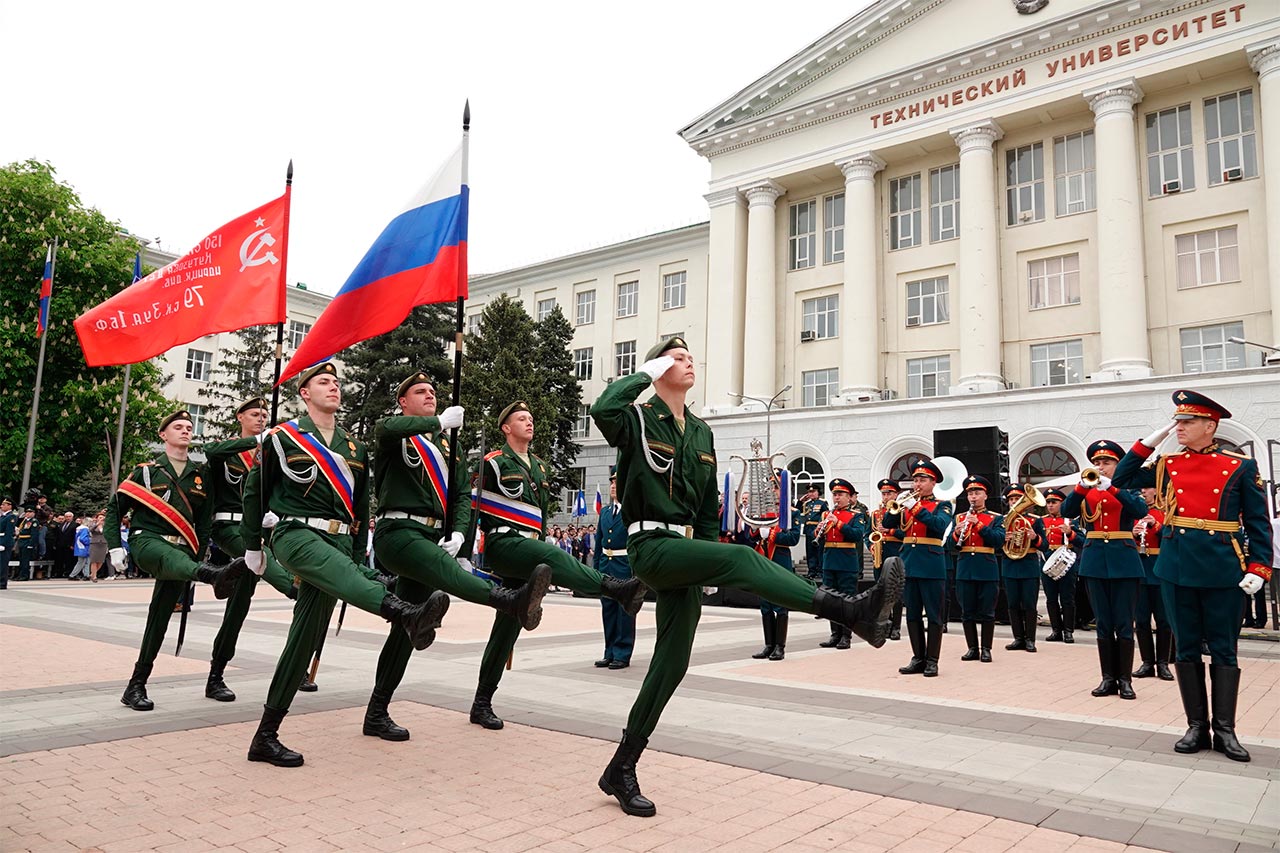 Парад студентов — курсантов военных учебных центров ДГТУ, ЮФУ, ИУБиП, ЮРГПУ (НПИ), РГУПС, РГЭУ (РИНХ), РостГМУ, РАНХиГС, Ростовского филиала РТА, кадетского корпуса ДГТУ и юнармейцев принимали руководители вузов, представители постпредства в Южном федеральном округе, правительства Ростовской области. С приветственным словом к студентам обратился ректор ДГТУ Бесарион Месхи .
