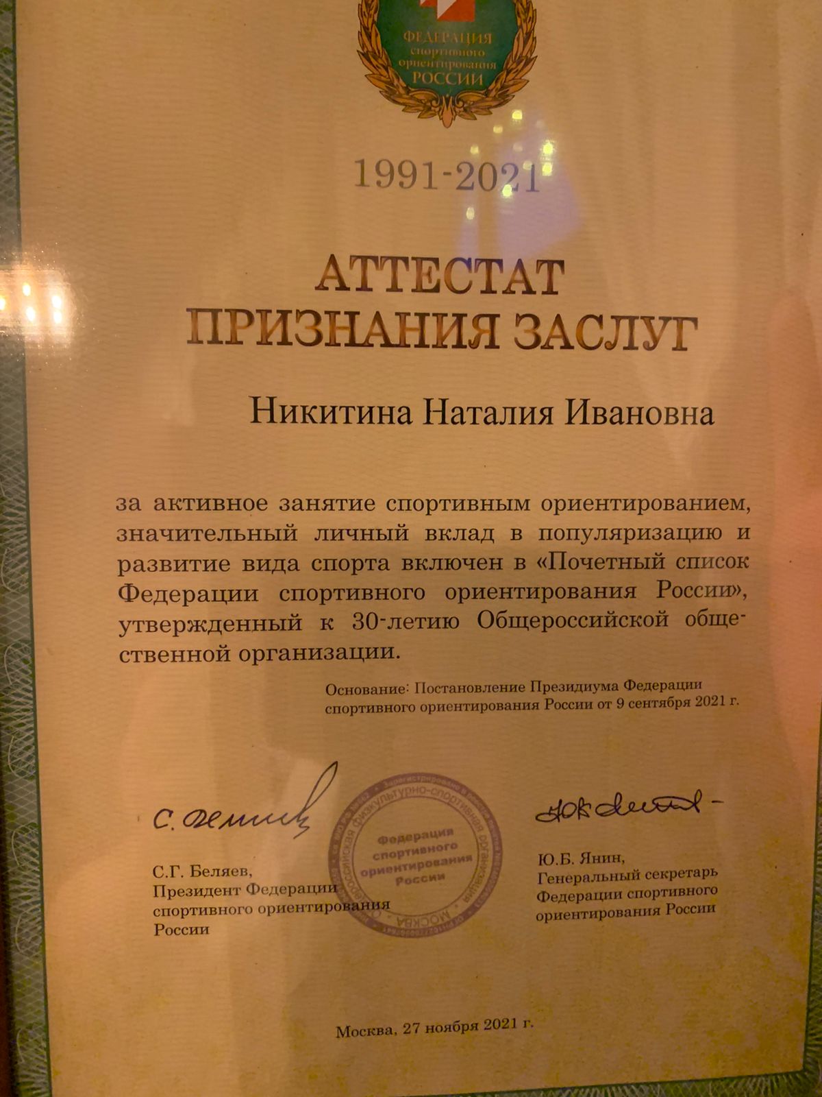 Наталия Ивановна Никитина включена в "Почётный список Федерации спортивного ориентирования России"