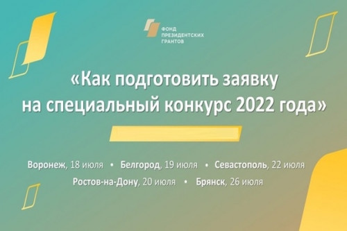 Заявки на конкурс принимаются до 15 августа. А 20 июля для тех, кто намерен принять участие в конкурсе, состоится семинар «Как подать заявку на специальный конкурс–2022». Семинар, организован Фондом президентских грантов при поддержке автономной некоммерческой организации «Агентство развития гражданских инициатив Ростовской области» и министерства региональной политики и массовых коммуникаций региона. Спикером будет исполнительный директор Фонда президентских грантов Антон Долгов. Место проведения семинара — конгресс-холл Донского государственного технического университета, 6 этаж (Ростов-на-Дону, площадь Гагарина, 1). Для участие необходима регистрация. Пройти ее можно здесь. Регистрация представителей социально ориентированных некоммерческих организаций области на ресурсе: https://sozidateli.ru/portal/event/87