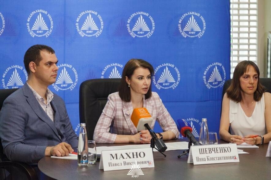 На вопросы журналистов отвечали ректор ЮФУ Инна Шевченко, проректор по образовательной деятельности и информационным технологиям Павел Махно и ответственный секретарь приемной комиссии ЮФУ Юлия Лихачева.