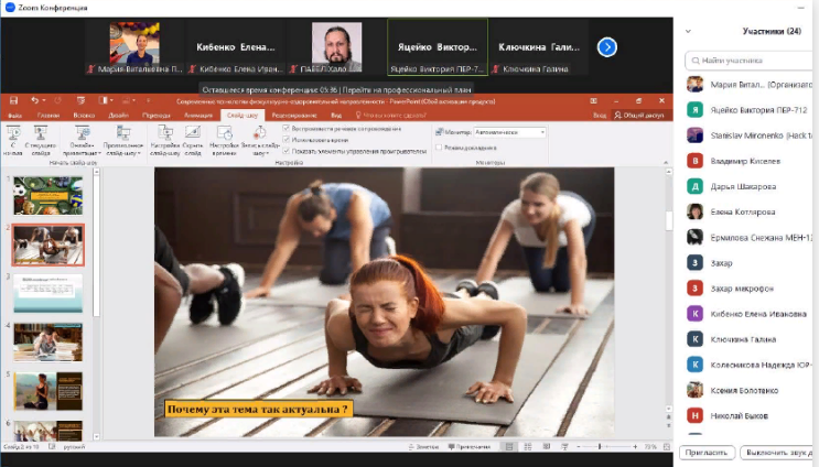 В финальном мероприятии, организованном на платформе zoom, с приветственным словом к конкурсантам и гостям Регионального конкурса научных практико-ориентированных проектов обучающихся «Спорт для всех, спорт для здоровья» выступили руководитель студенческого бюро Елена Котлярова, заведующая кафедрой физической культуры Таганрогского института им. А.П. Чехова (филиала) РГЭУ (РИНХ) Елена Кибенко. Модераторами финального этапа Конкурса являлись преподаватели кафедры ФВСиТ РГЭУ(РИНХ) Николай Быков и Мария Попова.