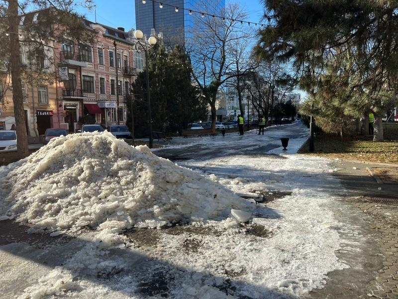 А улица Пушкинская тем временем превратилась в самый настоящий каток. Техника с самого утра чистила улицу. В итоге там образовались целые сугробы из льда.