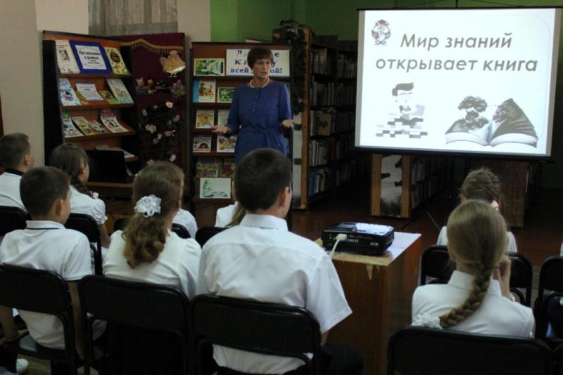 К Международному дню распространения грамотности в библиотеке им. М. А. Шолохова для учеников 4 «А» класса МБОУ СОШ №37 прошел библиотечный урок «Мир знаний открывает книга».