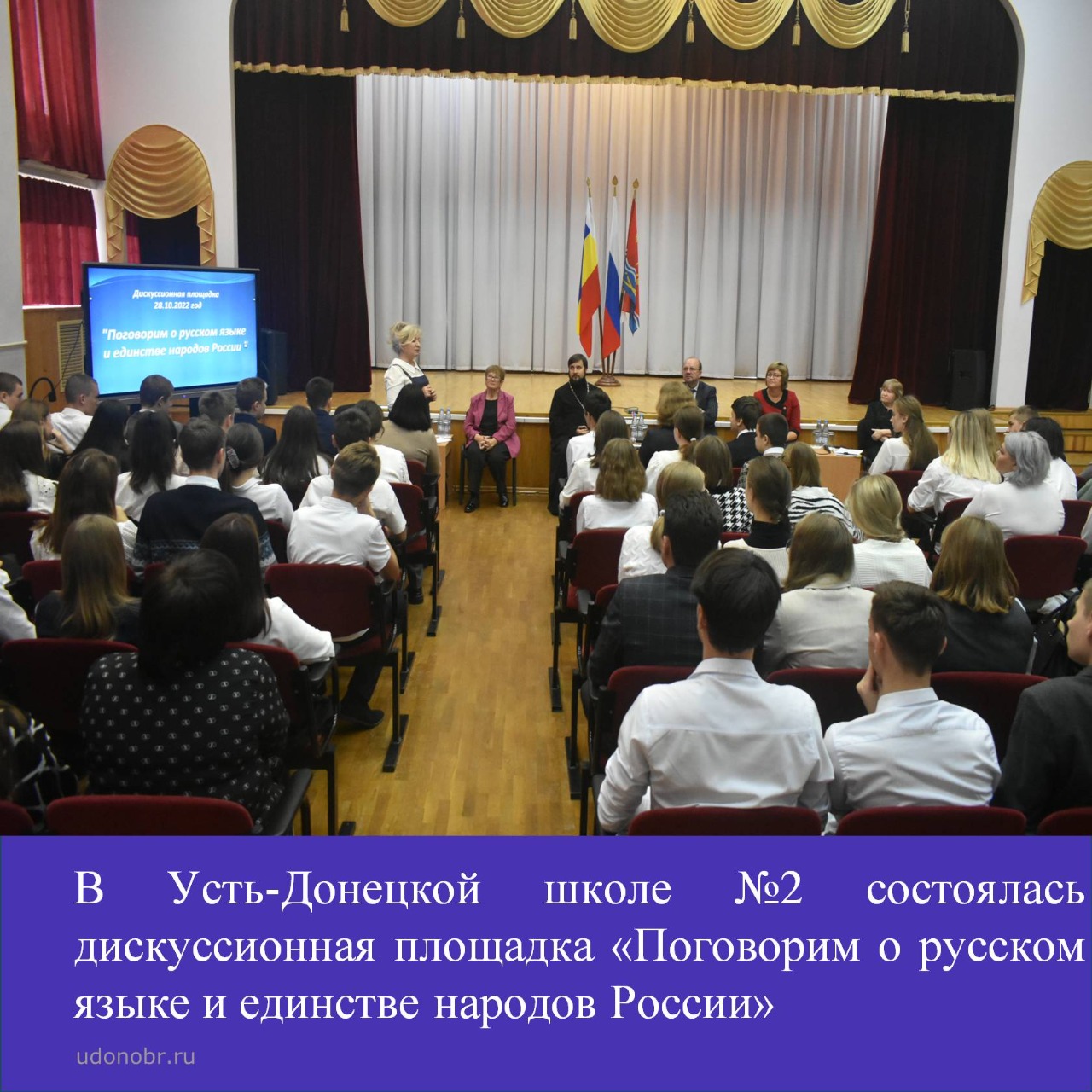 В Усть-Донецкой школе №2 в актовом зале состоялась дискуссионная площадка «Поговорим о русском языке и единстве народов России». Участниками стали старшеклассники школ нашего района.
