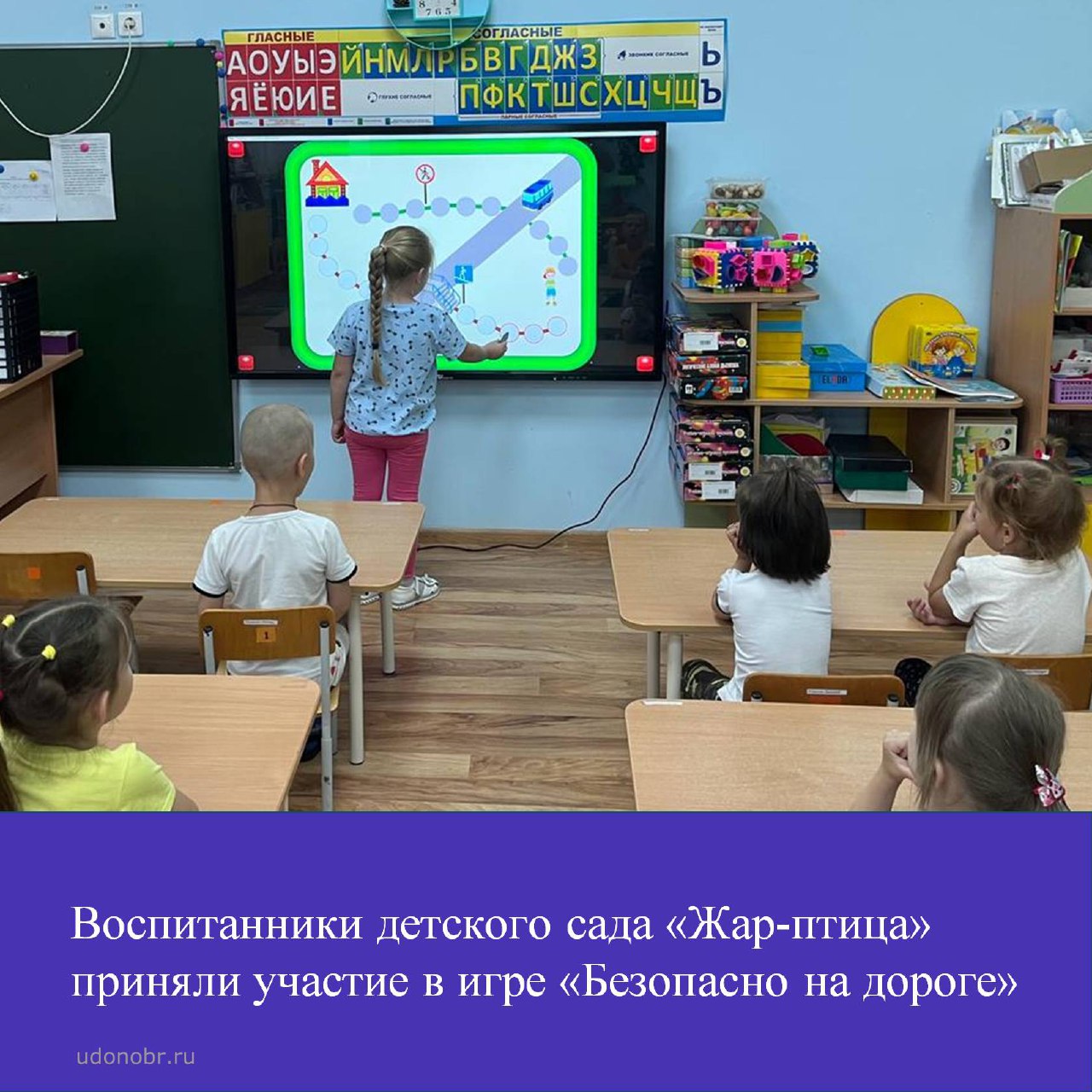 Воспитанники детского сада «Жар-птица» приняли участие в игре «Безопасно на дороге» с использованием интерактивного оборудования. В игровой форме ребята попробовали себя в роли пешехода, пассажира, водителя и продемонстрировали свои знания правил дорожного движения.
