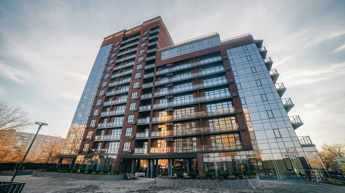 В доме предусмотрены две секции высотой 9 и 14 этажей, облицовку сделали керамическим кирпичом из Баварии. Каркас построили с помощью европейского оборудования Peri.