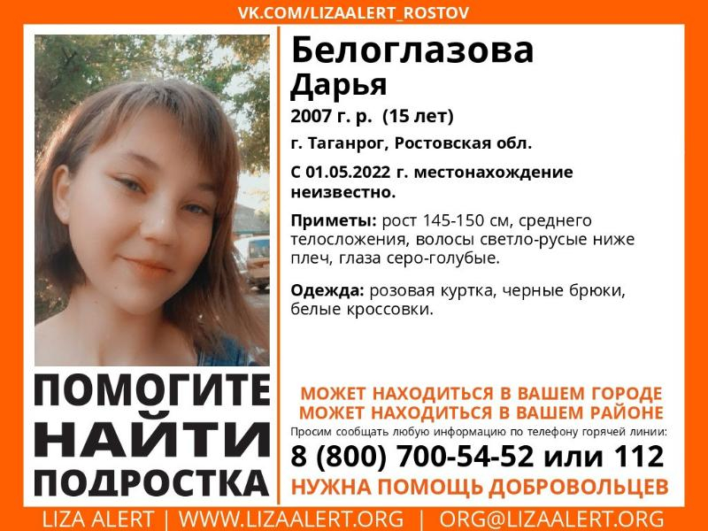15-летняя Дарья Белоглазова пропала в Таганроге в воскресенье, 1 мая. Рост девочки 140-150 см, среднего телосложения, волосы светло-русые ниже плеч, глаза серо-голубые.