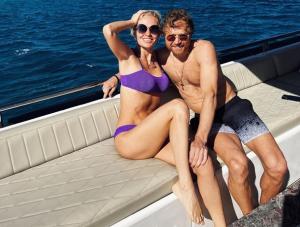 На фотографии тренер с женой Дарьей запечатлены на фоне водоема. Супруги позируют на судне, сидя на диване. Купальник молодой мамы выгодно подчеркивает ее стройное тело. Пара смотрит в камеру и улыбается.
