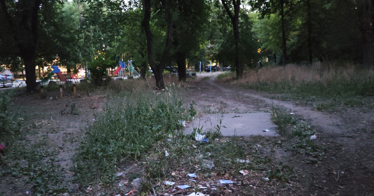 В приоритете уборки части Советского района Ростова — территория перед подъездами. Здесь заметен труд дворников. Входы к подъездам и дорожки чистые. Совсем иная ситуация на газонах. Сухая трава превратила их в непроходимые заросли. Дополняет картину застрявший в сухостое мусор.