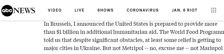 «Нам сообщили во Всемирной продовольственной программе ООН, что гуманитарная помощь доходит до крупных городов Украины. Но не в Метрополь — нет, извините — не в Мариуполь», — сказал глава Белого дома (цитата по репортажу американской телекомпании Эй-Би-Си).