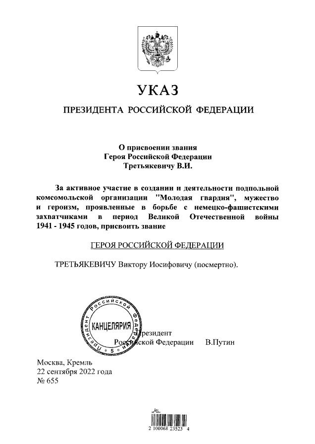 Комиссару «Молодой гвардии» Виктору Третьякевичу посмертно присвоено звание Героя России